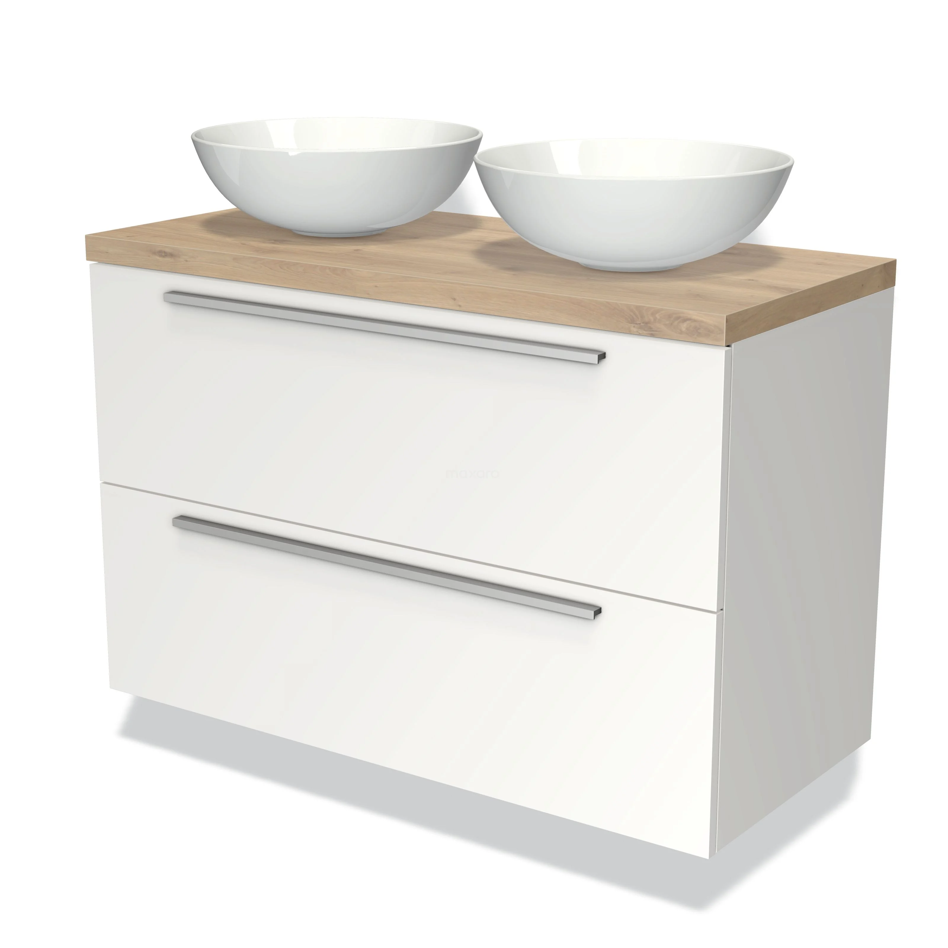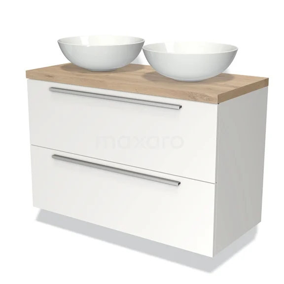 Badmöbel für Aufsatzwaschbecken 100cm Modulo Plato Matt Weiß 2 Schubladen Flach Hellbraune Eiche Platte