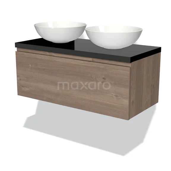 Badmöbel für Aufsatzwaschbecken 100cm Modulo Plato mittelbraune Eiche 1 Schublade grifflos Hochglanz Schwarz Platte