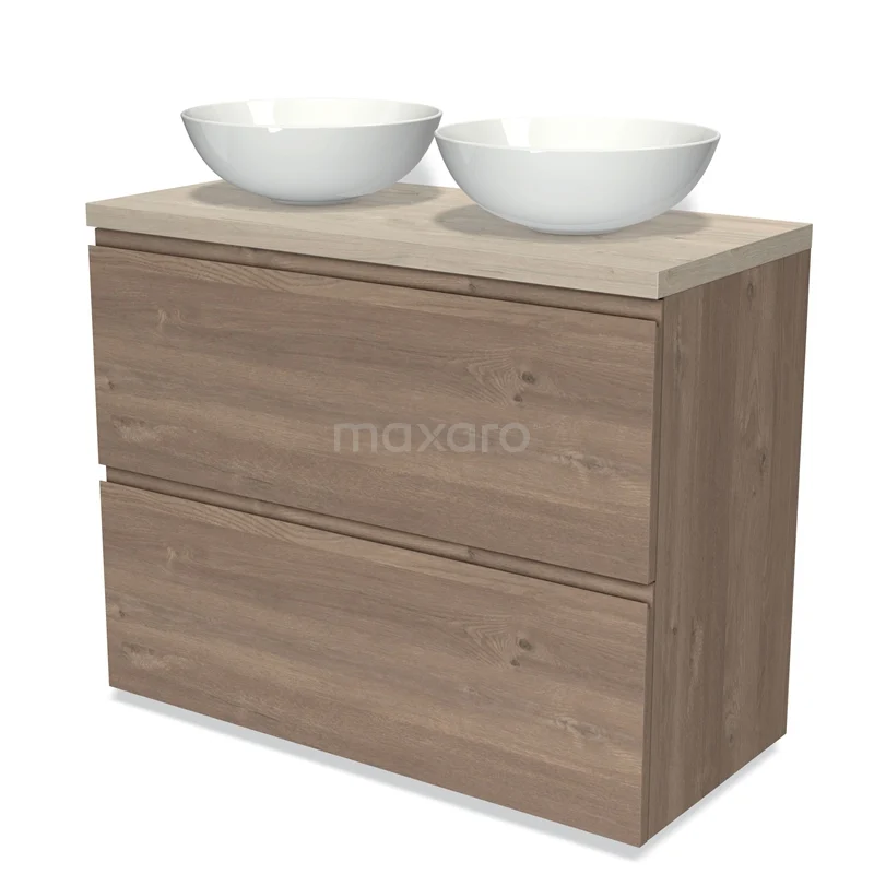 Badmöbel für Aufsatzwaschbecken 100cm Modulo Plato mittelbraune Eiche 2 hohe Schubladen grifflos hellgraue Eiche Platte