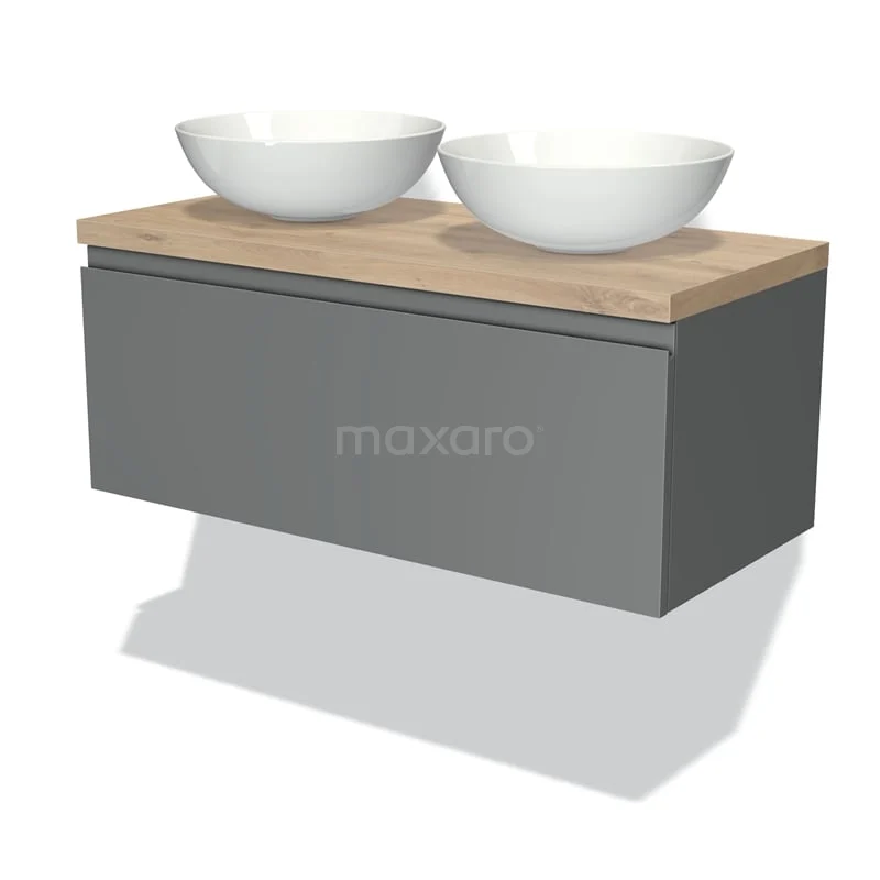 Badmöbel für Aufsatzwaschbecken 100cm Modulo Plato Mittelgrau 1 Schublade Grifflos Hellbraune Eiche Platte