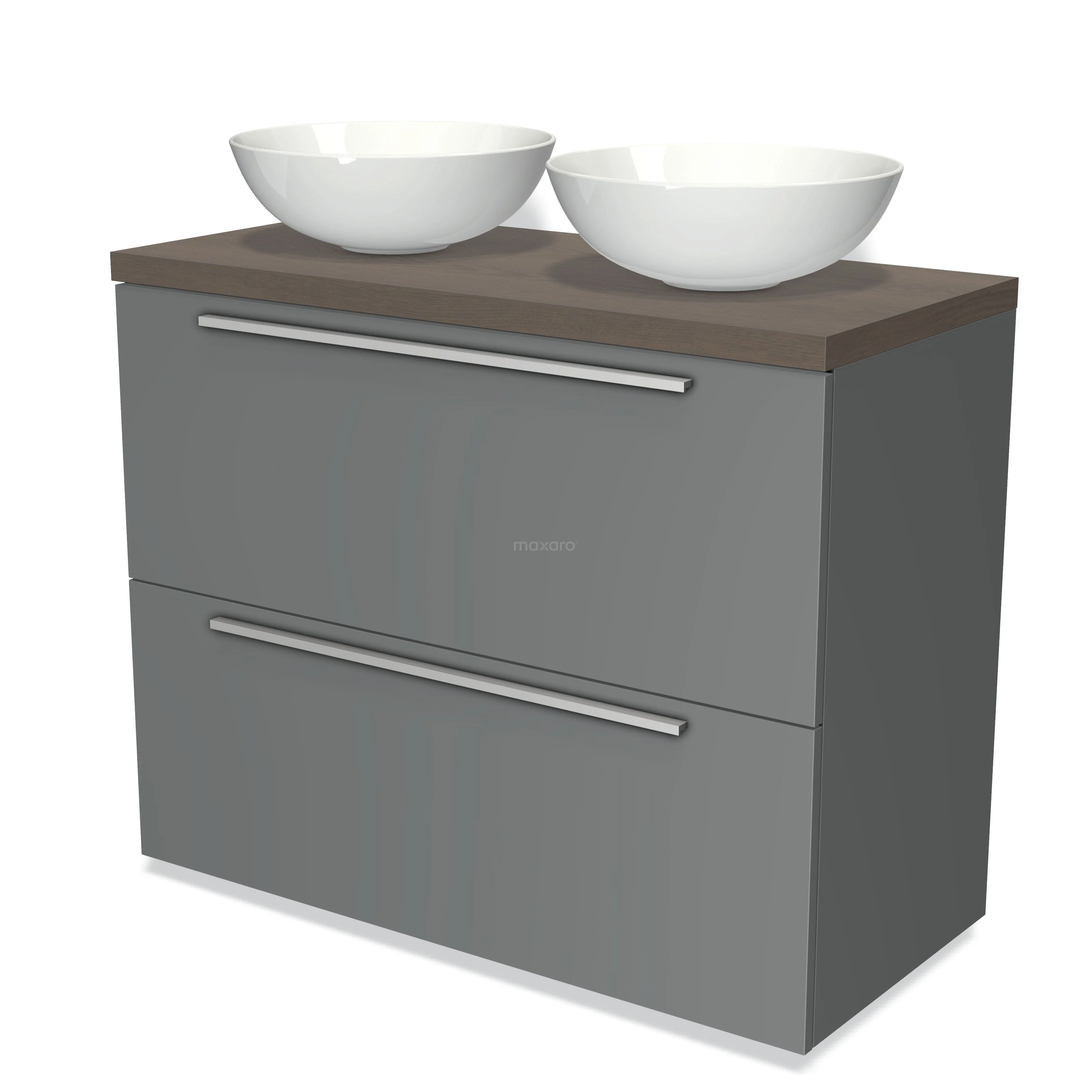 Badmöbel für Aufsatzwaschbecken 100cm Modulo Plato Mittelgrau 2 hohe Schubladen Flach dunkelbraune Eiche Platte