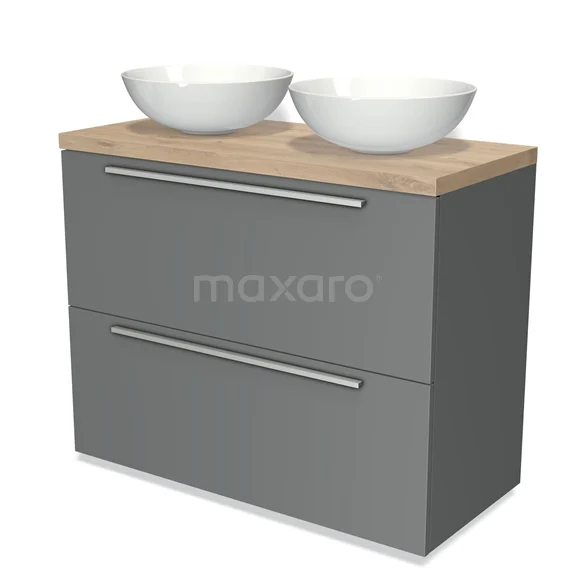 Badmöbel für Aufsatzwaschbecken 100cm Modulo Plato Mittelgrau 2 hohe Schubladen Flach Hellbraune Eiche Platte