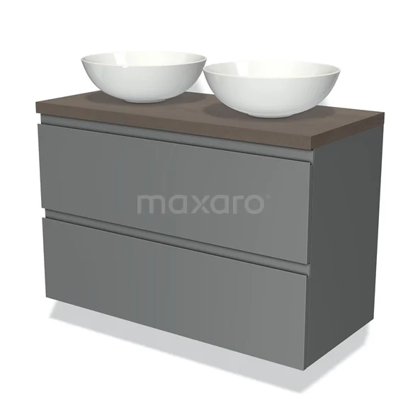 Badmöbel für Aufsatzwaschbecken 100cm Modulo Plato Mittelgrau 2 Schubladen Grifflos dunkelbraune Eiche Platte