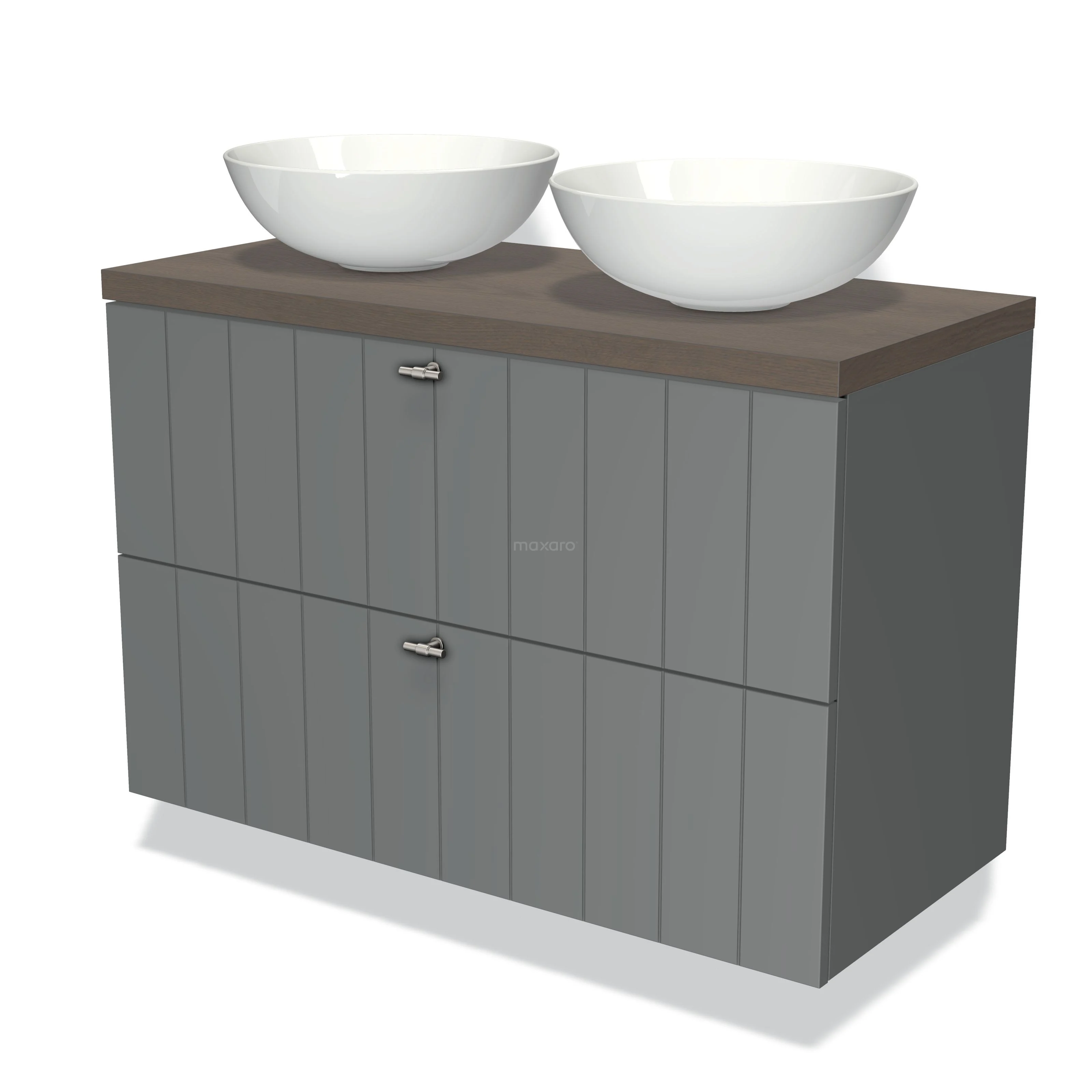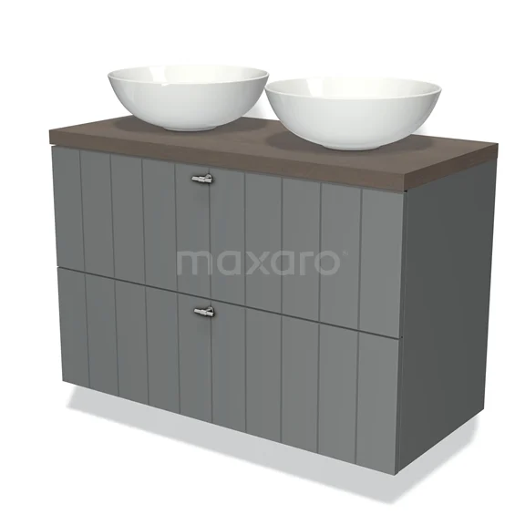Badmöbel für Aufsatzwaschbecken 100cm Modulo Plato Mittelgrau 2 Schubladen Lamelle dunkelbraune Eiche Platte