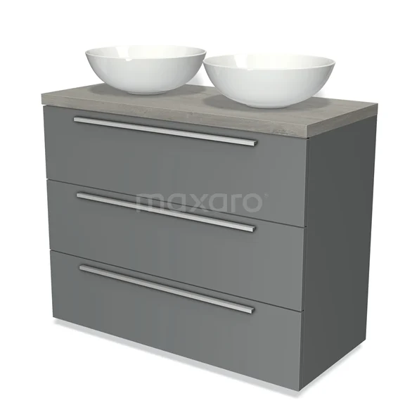Badmöbel für Aufsatzwaschbecken 100cm Modulo Plato Mittelgrau 3 Schubladen Flach Graue Eiche Platte