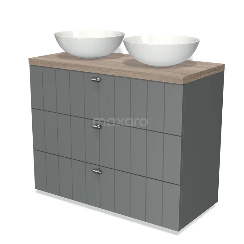 Badmöbel für Aufsatzwaschbecken 100cm Modulo Plato Mittelgrau 3 Schubladen Lamelle Eiche Platte