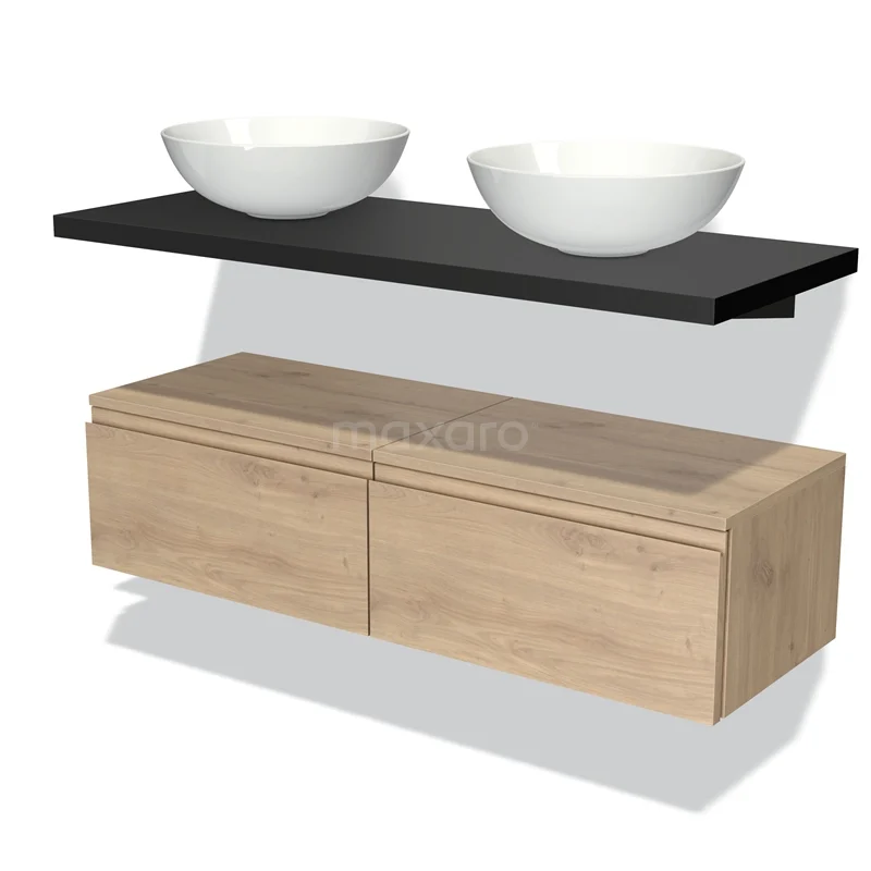 Badmöbel für Aufsatzwaschbecken 120 cm Modulo Plato Hellbraune Eiche 2 Schubladen Grifflos Matt Schwarz Platte