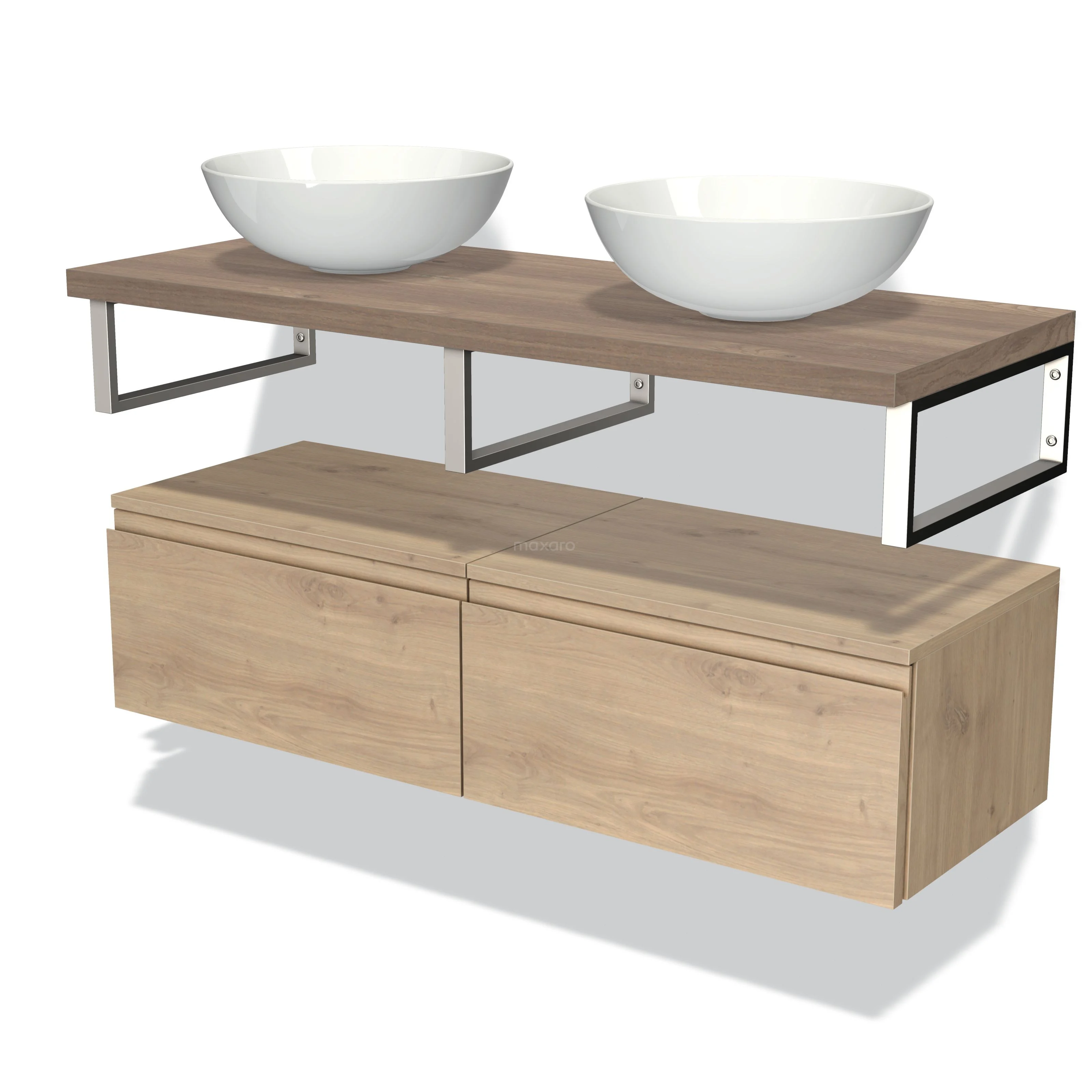 Badmöbel für Aufsatzwaschbecken 120 cm Modulo Plato Hellbraune Eiche 2 Schubladen Grifflose Platte aus mittelbrauner Eiche