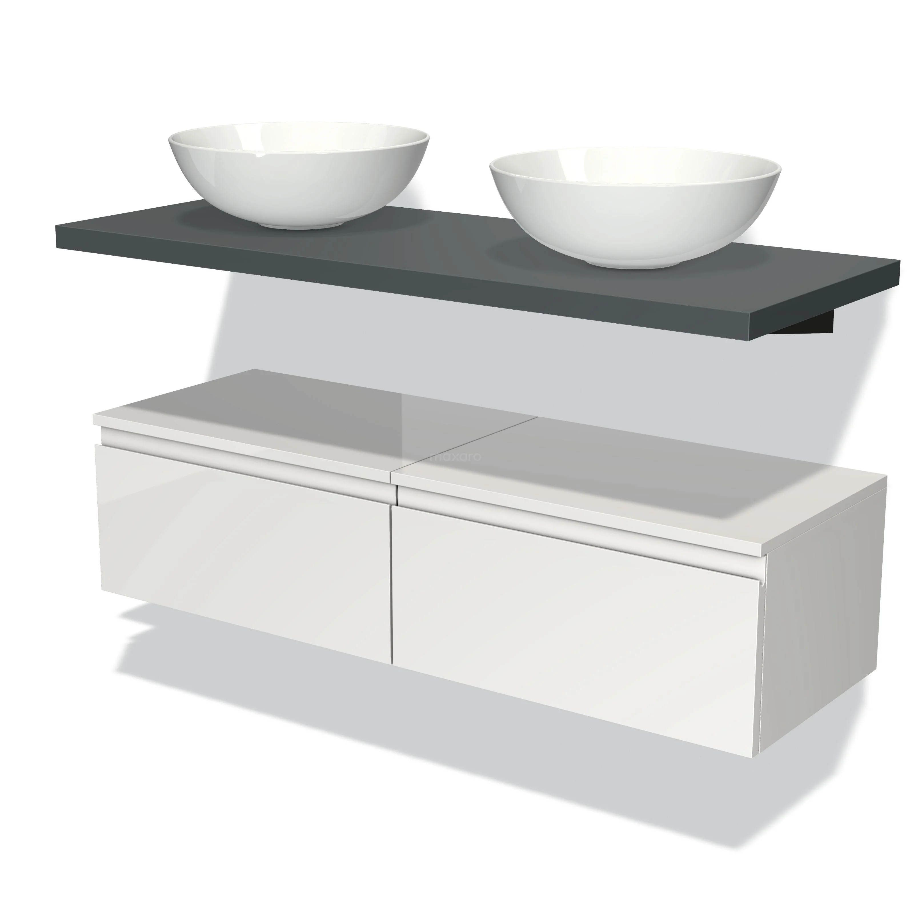 Modulo Plato Badmöbel mit Aufsatzwaschbecken | 120 cm Hochglanz Weiß Grifflos front Dunkelgrau blatt Tief hängend