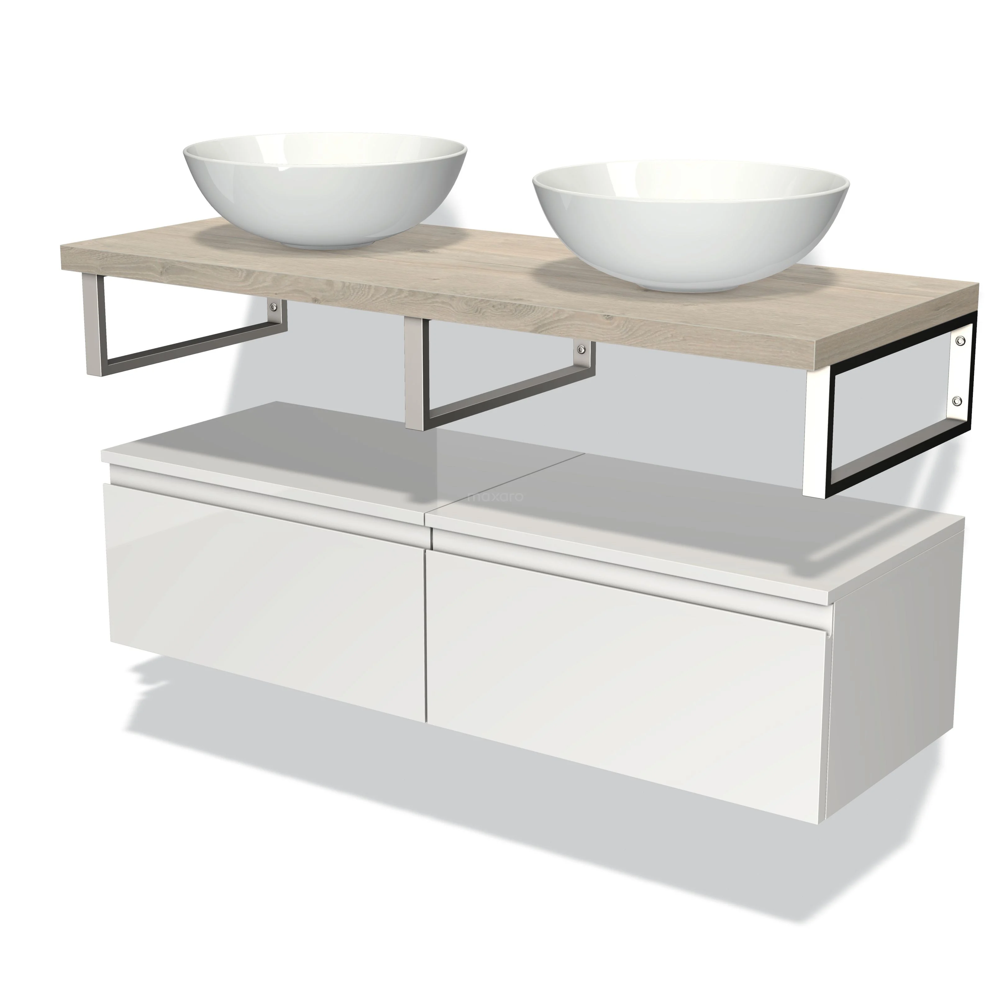 Modulo Plato Badmöbel mit Aufsatzwaschbecken | 120 cm Hochglanz Weiß Grifflos front Hellgraue Eiche blatt Tief hängend