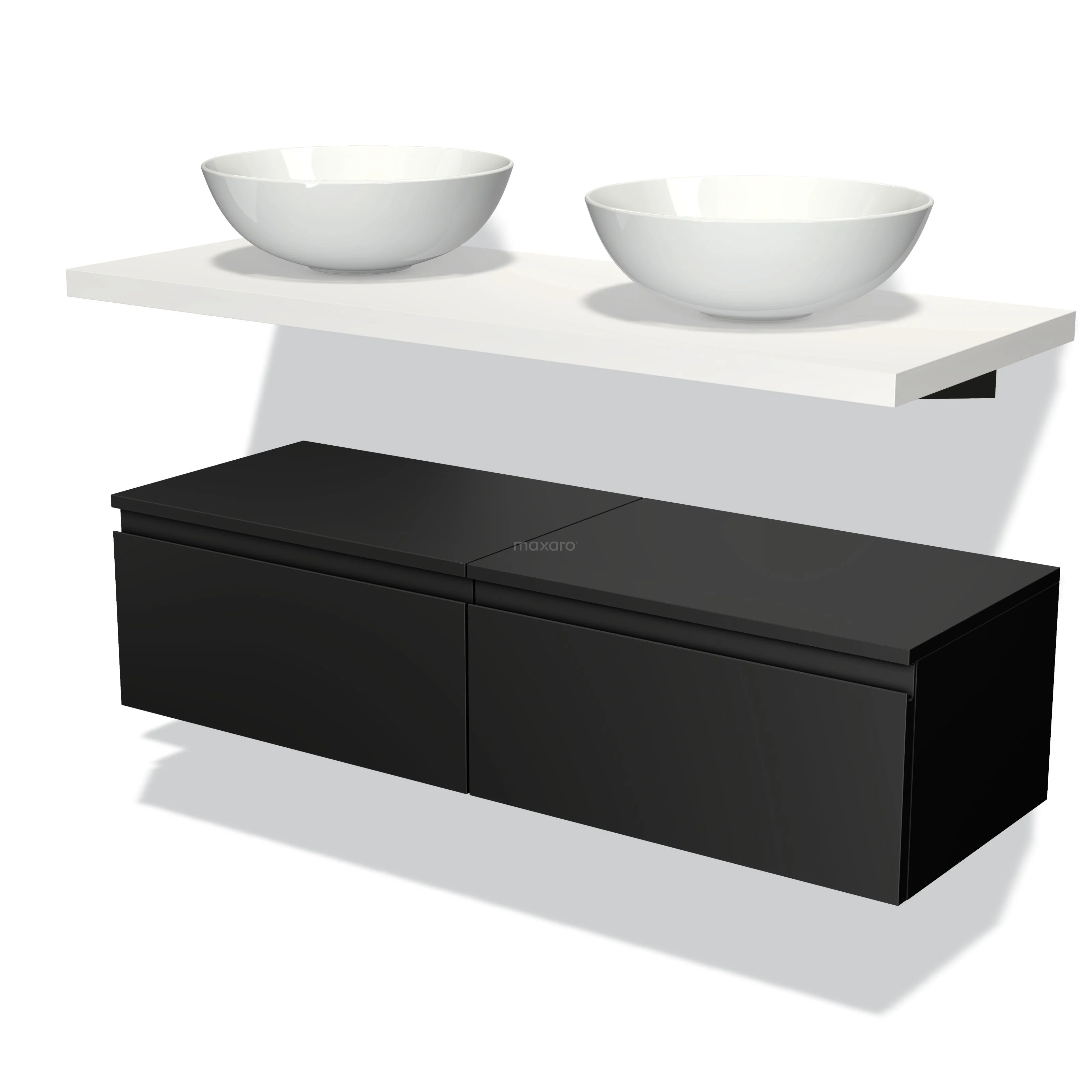 Badmöbel für Aufsatzwaschbecken 120 cm Modulo Plato Matt Schwarz 2 Schubladen Grifflos Matt Weiß Platte