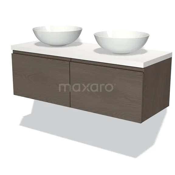 Badmöbel für Aufsatzwaschbecken 120cm Modulo Plato dunkelbraune Eiche 2 Schubladen grifflos Matt Weiß Platte