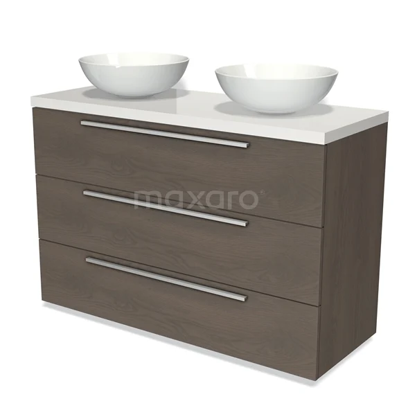 Badmöbel für Aufsatzwaschbecken 120cm Modulo Plato dunkelbraune Eiche 3 Schubladen Flach Hochglanz Weiß Platte