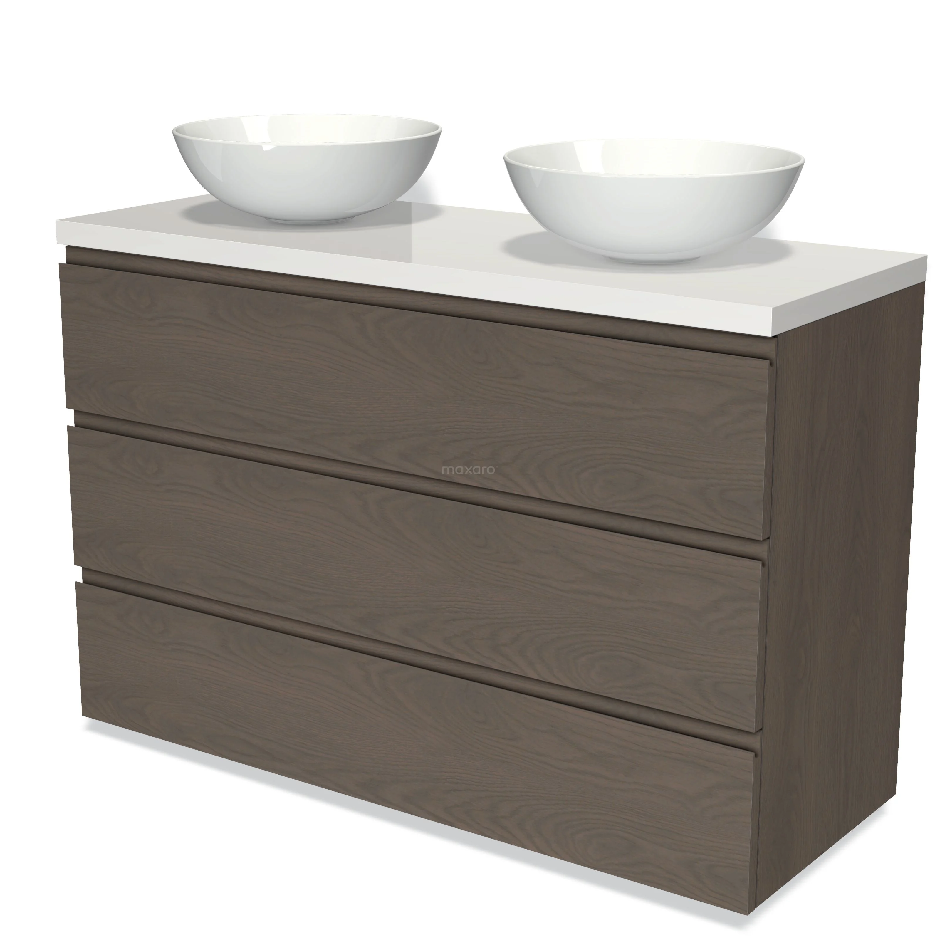 Modulo Plato Badmöbel mit Aufsatzwaschbecken | 120 cm Dunkelbraune Eiche Grifflos front Hochglanz Weiß blatt 3 Schubladen