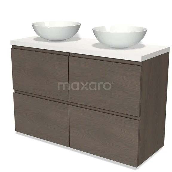 Badmöbel für Aufsatzwaschbecken 120cm Modulo Plato dunkelbraune Eiche 4 hohe Schubladen grifflos Matt Weiß Platte