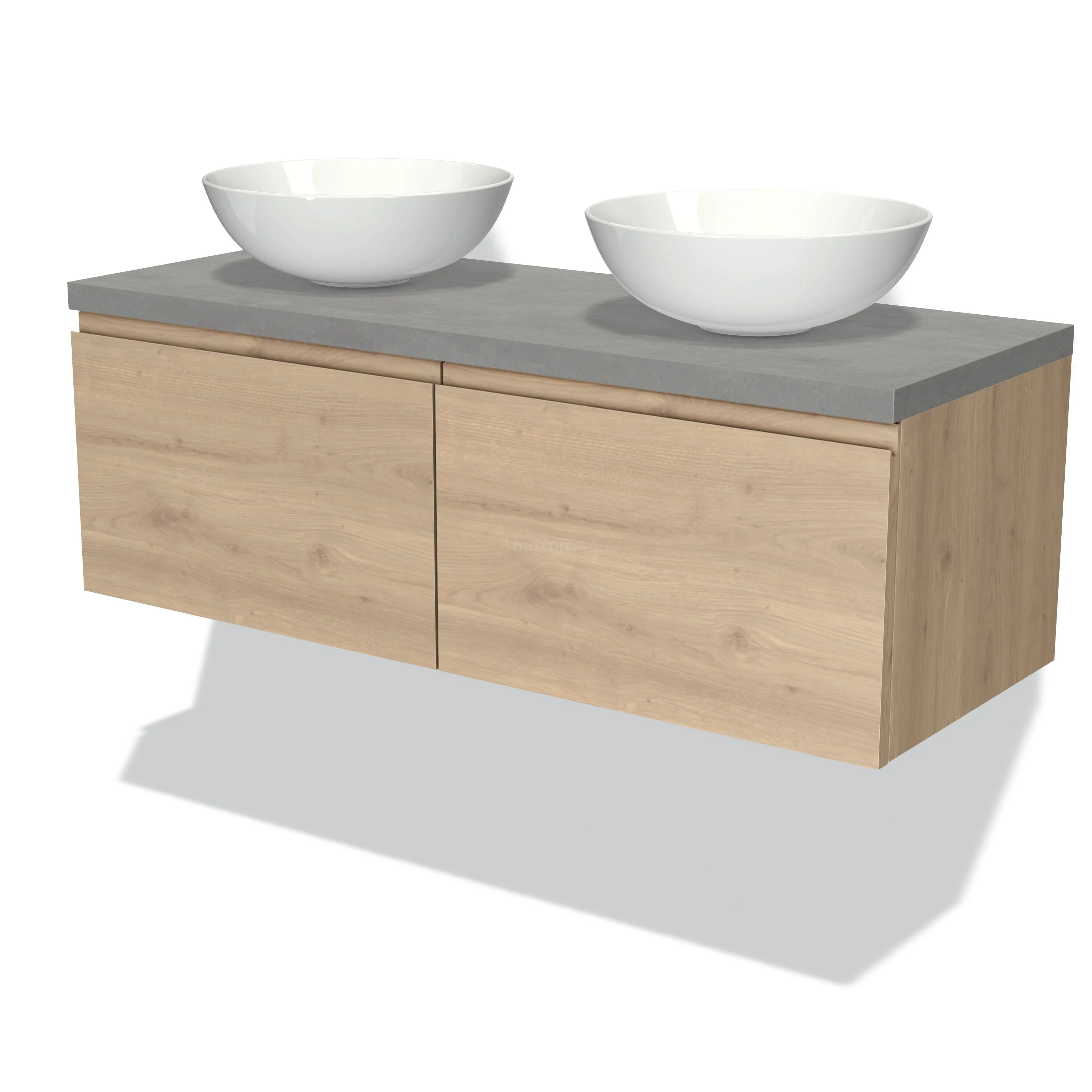 Badmöbel für Aufsatzwaschbecken 120cm Modulo Plato Hellbraune Eiche 2 Schubladen Grifflos Hellgrauer Beton Platte