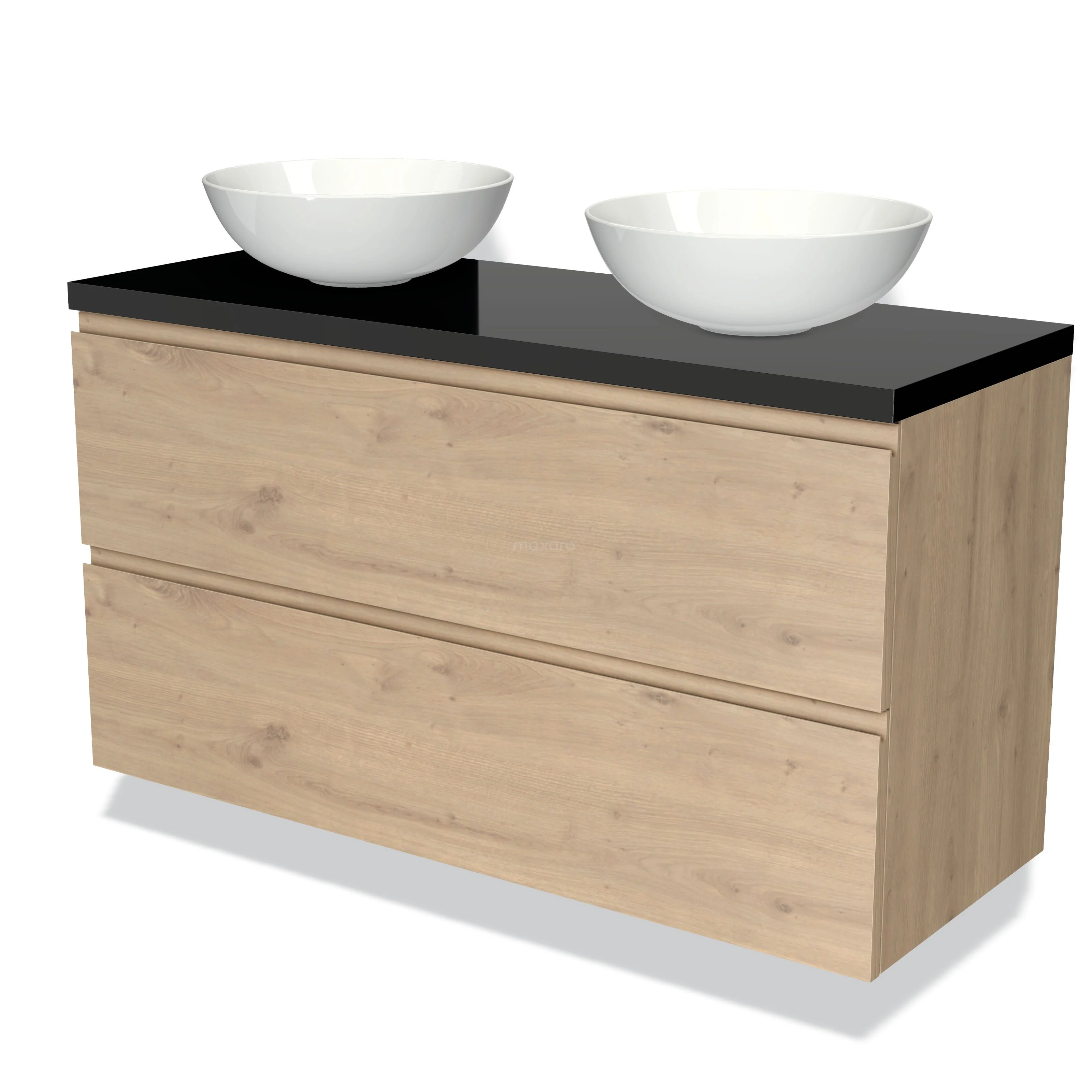 Modulo Plato Badmöbel mit Aufsatzwaschbecken | 120 cm Hellbraune Eiche Grifflos front Hochglanz Schwarz blatt 2 übereinanderliegende Schubladen