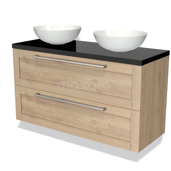 Badmöbel für Aufsatzwaschbecken 120cm Modulo Plato Hellbraune Eiche 2 Schubladen Rahmen Hochglanz Schwarz Platte