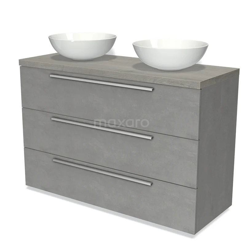 Badmöbel für Aufsatzwaschbecken 120cm Modulo Plato Hellgrauer Beton 3 Schubladen Flache graue Eiche Platte