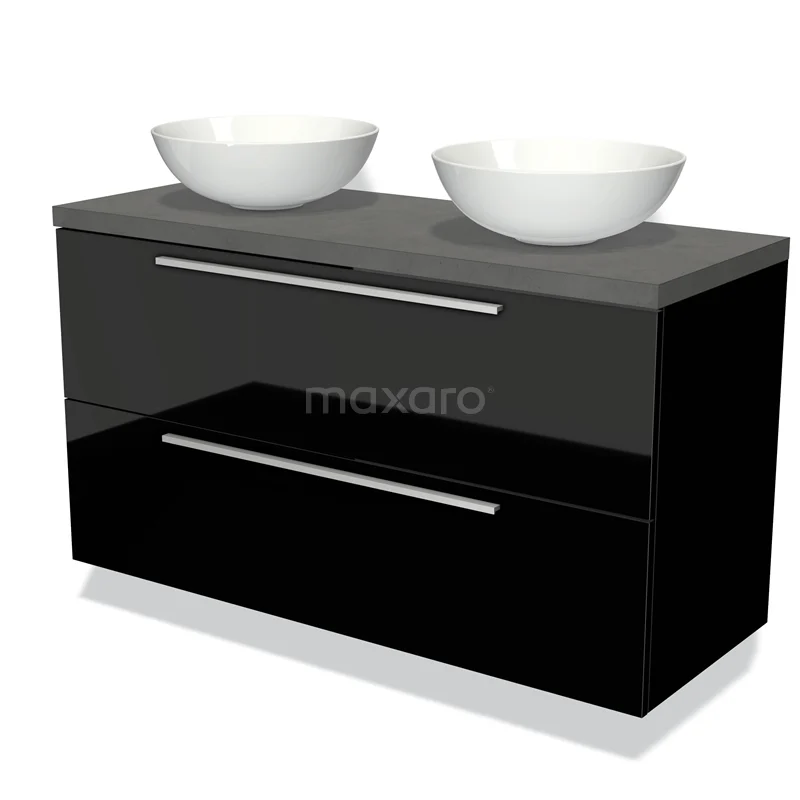 Badmöbel für Aufsatzwaschbecken 120cm Modulo Plato Hochglanz Schwarz 2 Schubladen Flach Dunkelgrau Beton Platte