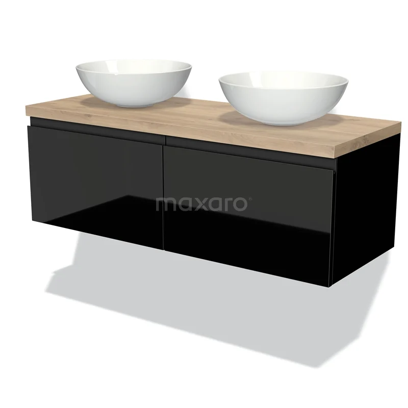 Badmöbel für Aufsatzwaschbecken 120cm Modulo Plato Hochglanz Schwarz 2 Schubladen Grifflos Hellbraune Eiche Platte