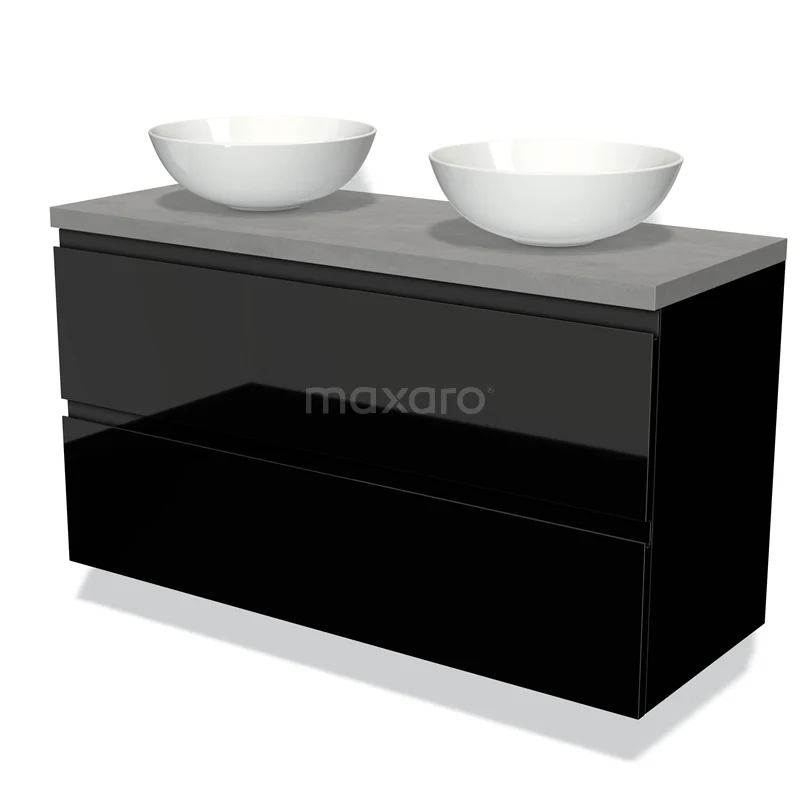 Badmöbel für Aufsatzwaschbecken 120cm Modulo Plato Hochglanz Schwarz 2 Schubladen Grifflos hellgrauer Beton Platte