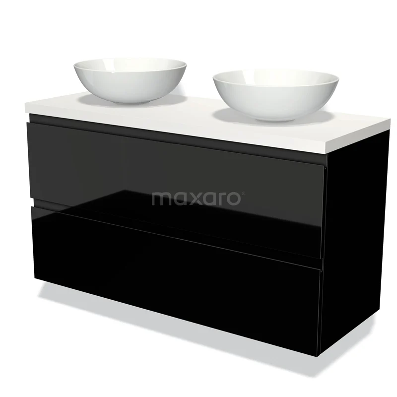 Badmöbel für Aufsatzwaschbecken 120cm Modulo Plato Hochglanz Schwarz 2 Schubladen Grifflos Matt Weiß Platte