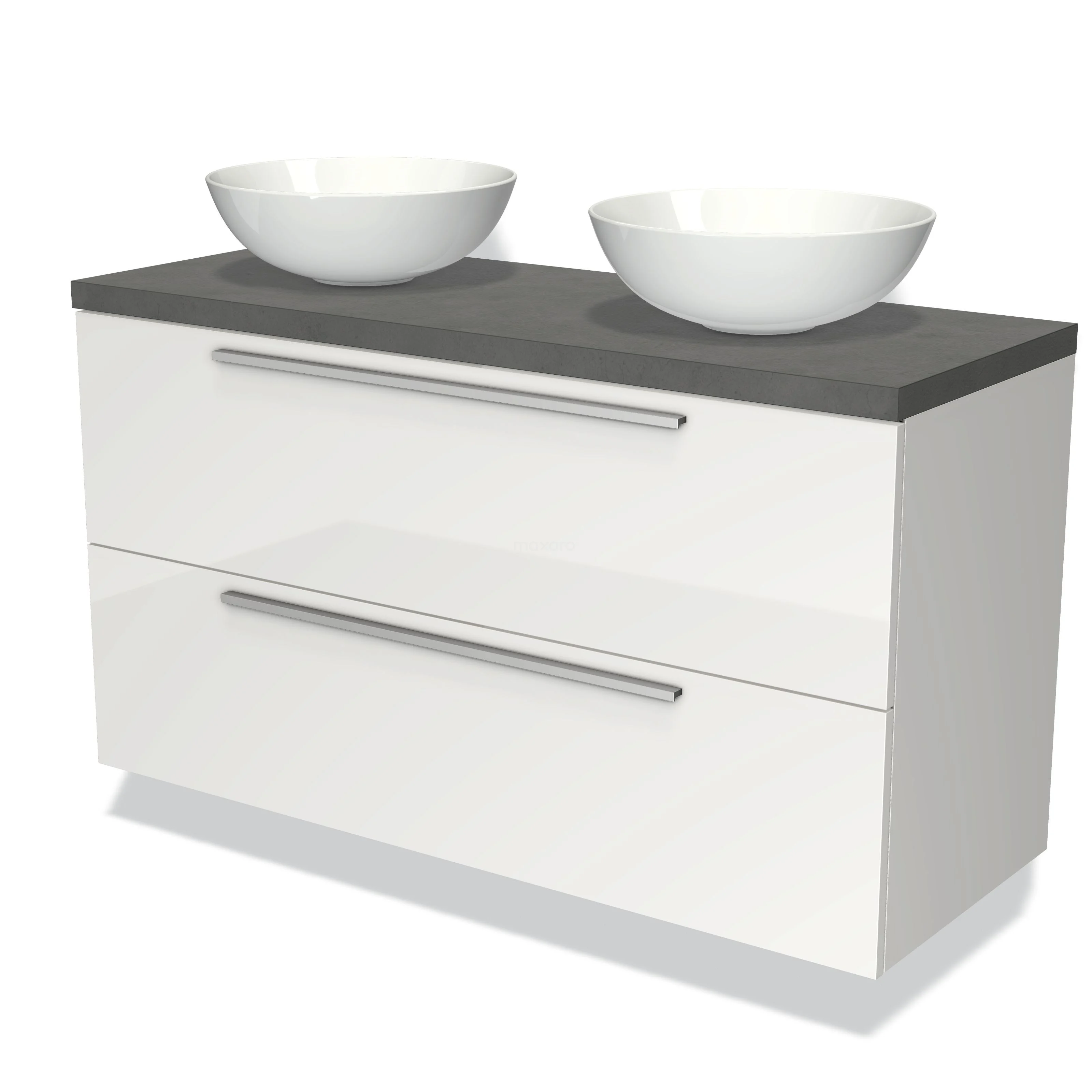 Badmöbel für Aufsatzwaschbecken 120cm Modulo Plato Hochglanz Weiß 2 Schubladen Flach Dunkelgrau Beton Platte