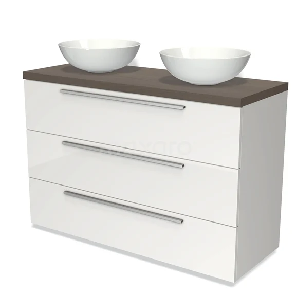 Modulo Plato Badmöbel mit Aufsatzwaschbecken | 120 cm Hochglanz Weiß Flach front Dunkelbraune Eiche blatt 3 Schubladen