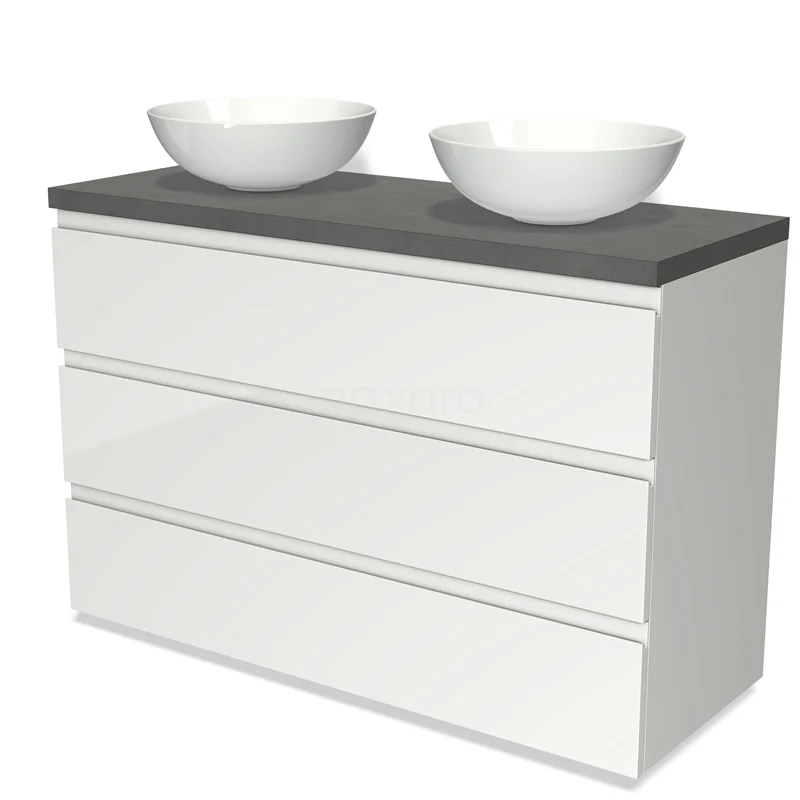 Badmöbel für Aufsatzwaschbecken 120cm Modulo Plato Hochglanz Weiß 3 Schubladen Grifflos Dunkelgrau Beton Platte