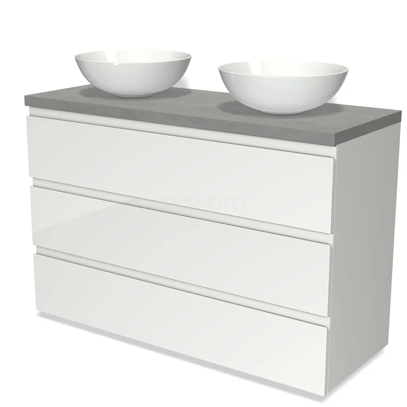 Modulo Plato Badmöbel mit Aufsatzwaschbecken | 120 cm Hochglanz Weiß Grifflos front Hellgrauer Beton blatt 3 Schubladen