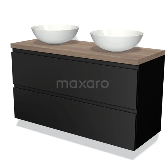 Badmöbel für Aufsatzwaschbecken 120cm Modulo Plato Matt Schwarz 2 Schubladen Grifflos Mittelbraune Eiche Platte
