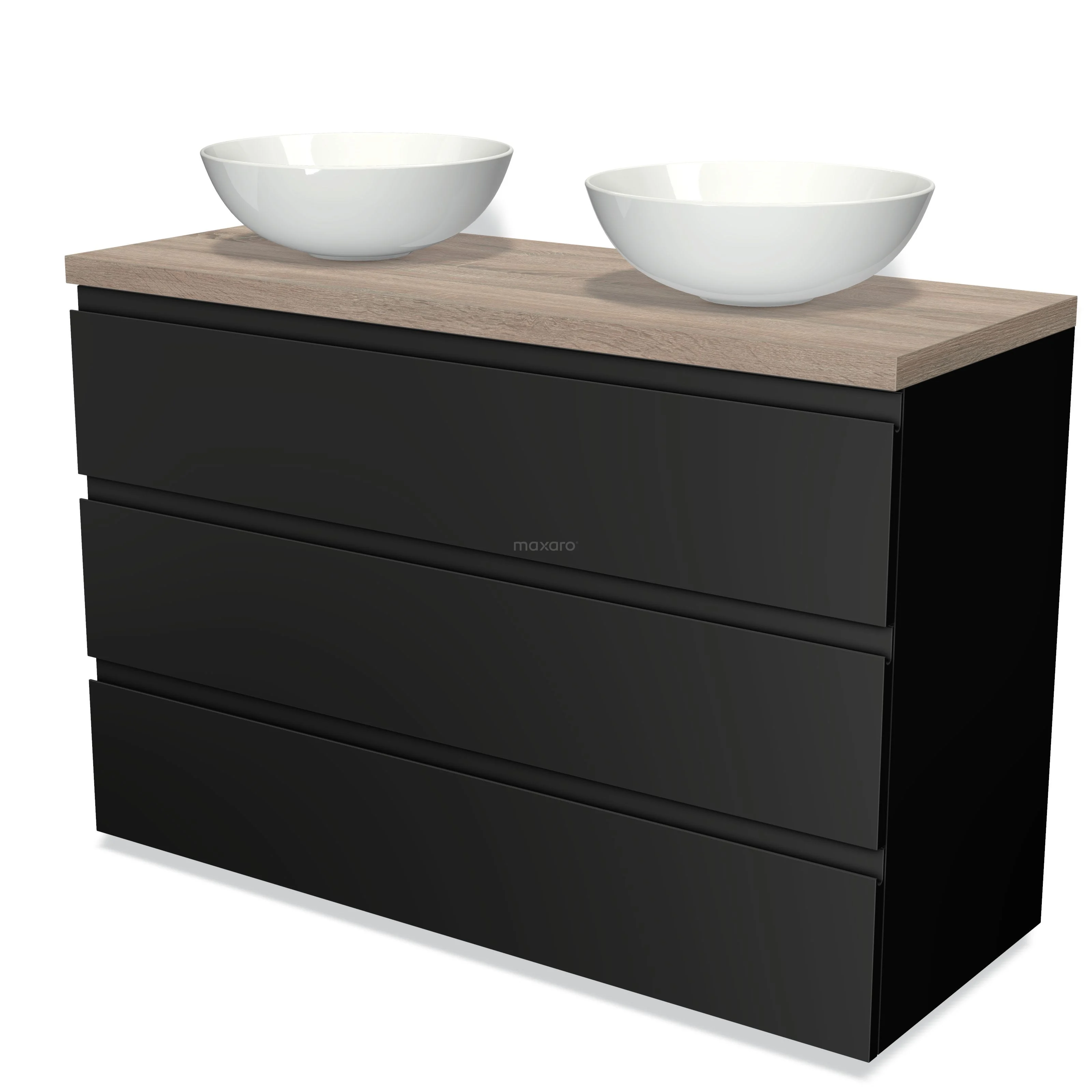 Badmöbel für Aufsatzwaschbecken 120cm Modulo Plato Matt Schwarz 3 Schubladen Grifflos Eiche Platte