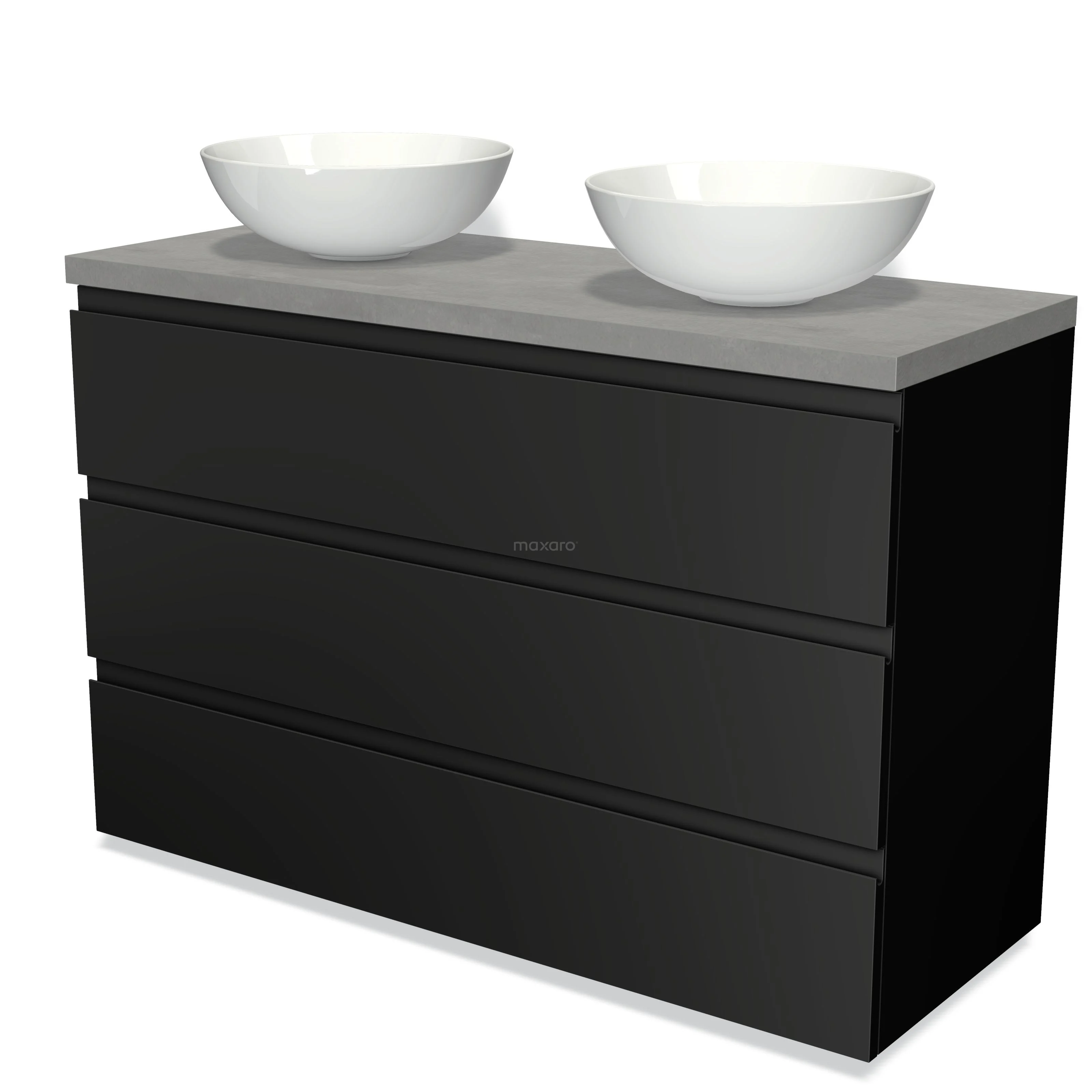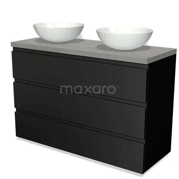 Modulo Plato Badmöbel mit Aufsatzwaschbecken | 120 cm Matt Schwarz Grifflos front Hellgrauer Beton blatt 3 Schubladen