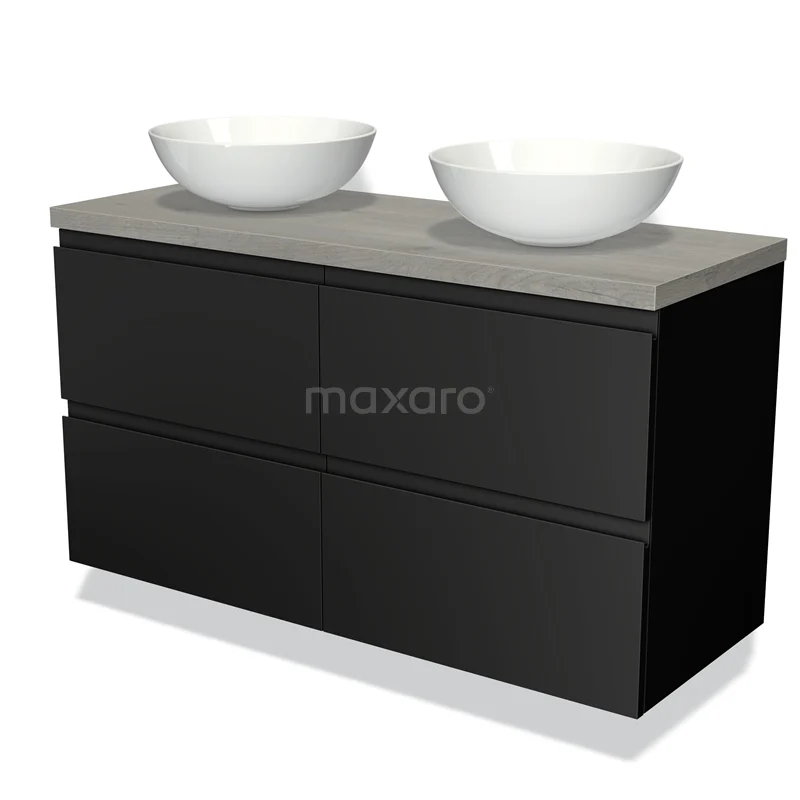 Badmöbel für Aufsatzwaschbecken 120cm Modulo Plato Matt Schwarz 4 Schubladen Grifflos Graue Eiche Platte