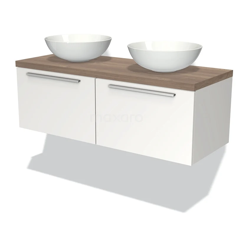 Badmöbel für Aufsatzwaschbecken 120cm Modulo Plato Matt Weiß 2 Schubladen Flach Mittelbraune Eiche Platte