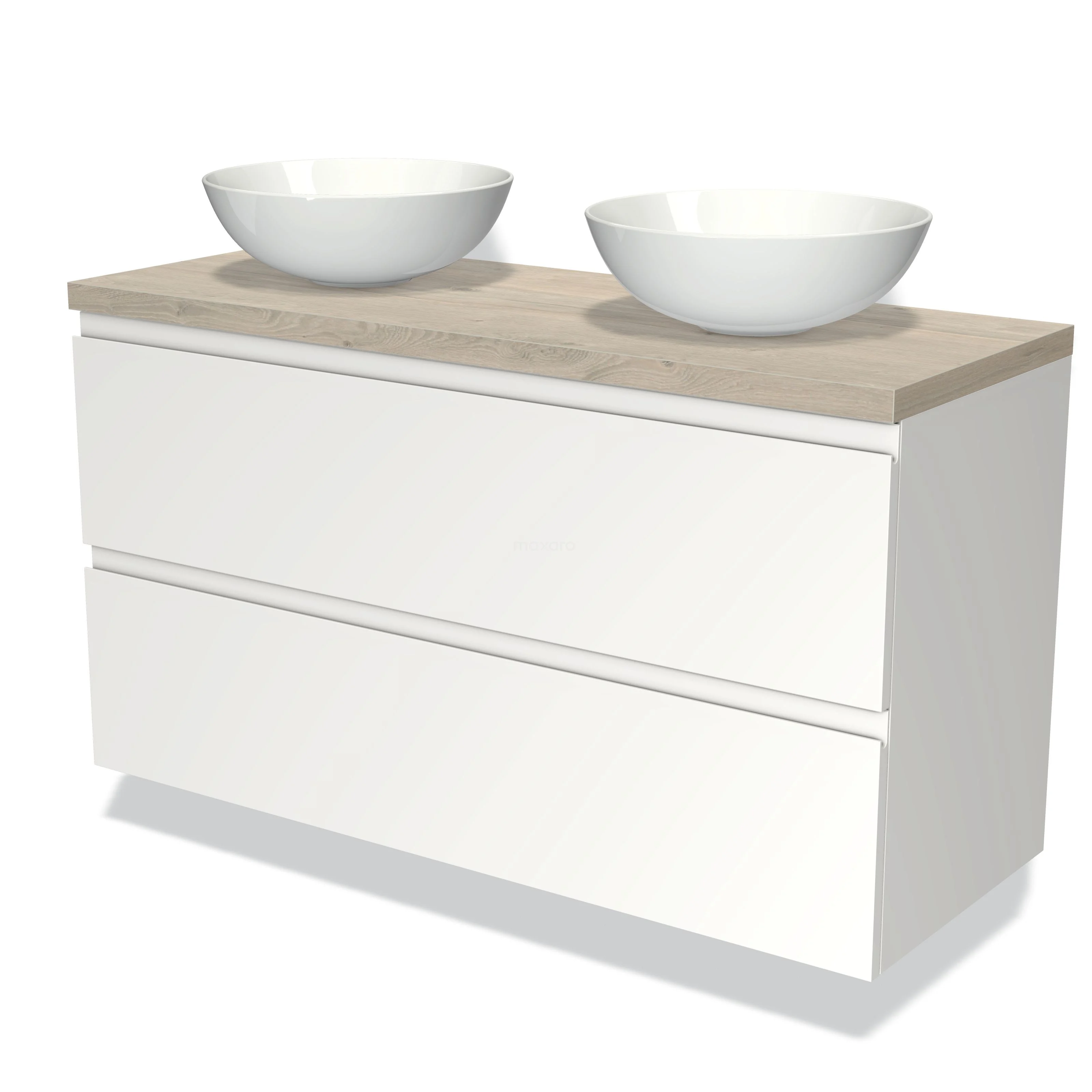 Badmöbel für Aufsatzwaschbecken 120cm Modulo Plato Matt Weiß 2 Schubladen Grifflos Hellgraue Eiche Platte