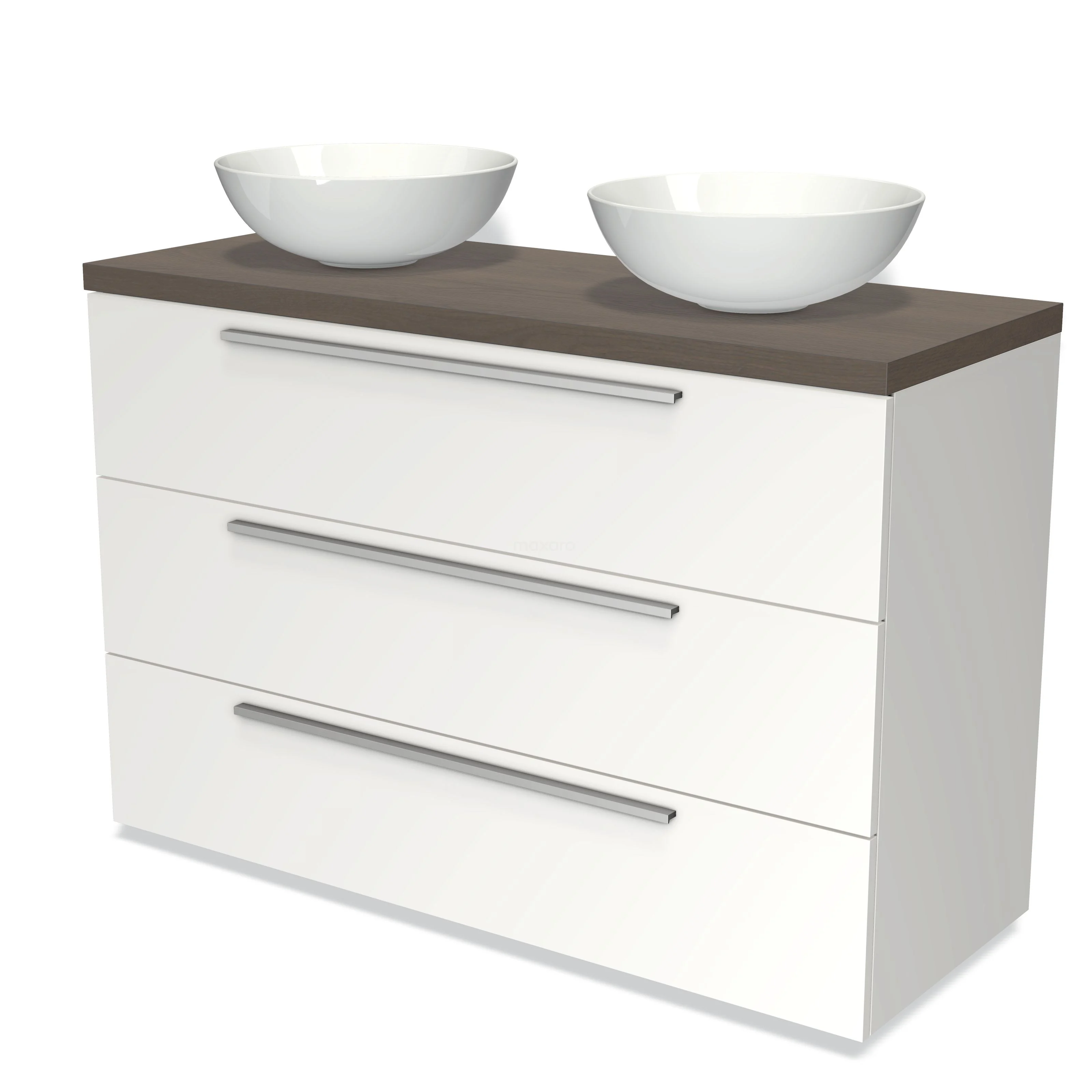 Badmöbel für Aufsatzwaschbecken 120cm Modulo Plato Matt Weiß 3 Schubladen Flach dunkelbraune Eiche Platte
