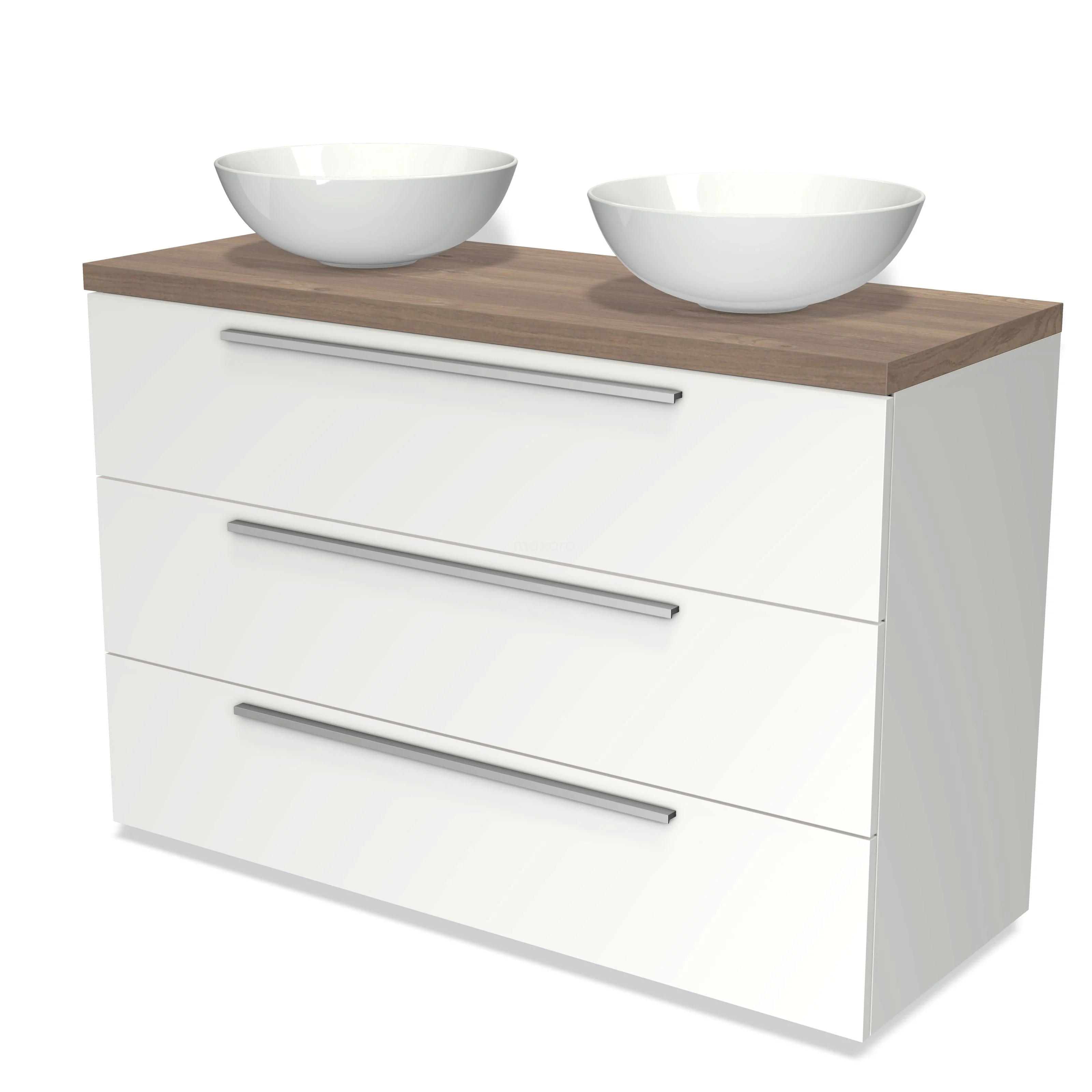Badmöbel für Aufsatzwaschbecken 120cm Modulo Plato Matt Weiß 3 Schubladen Flach Mittelbraune Eiche Platte