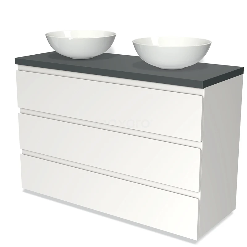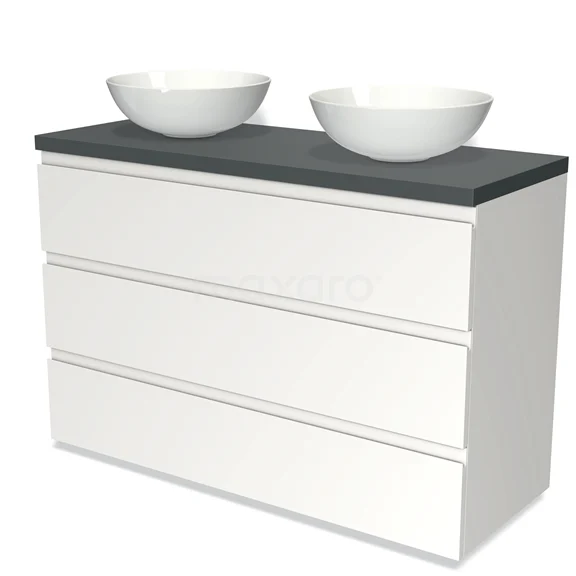 Badmöbel für Aufsatzwaschbecken 120cm Modulo Plato Matt Weiß 3 Schubladen Grifflos Dunkelgrau Platte