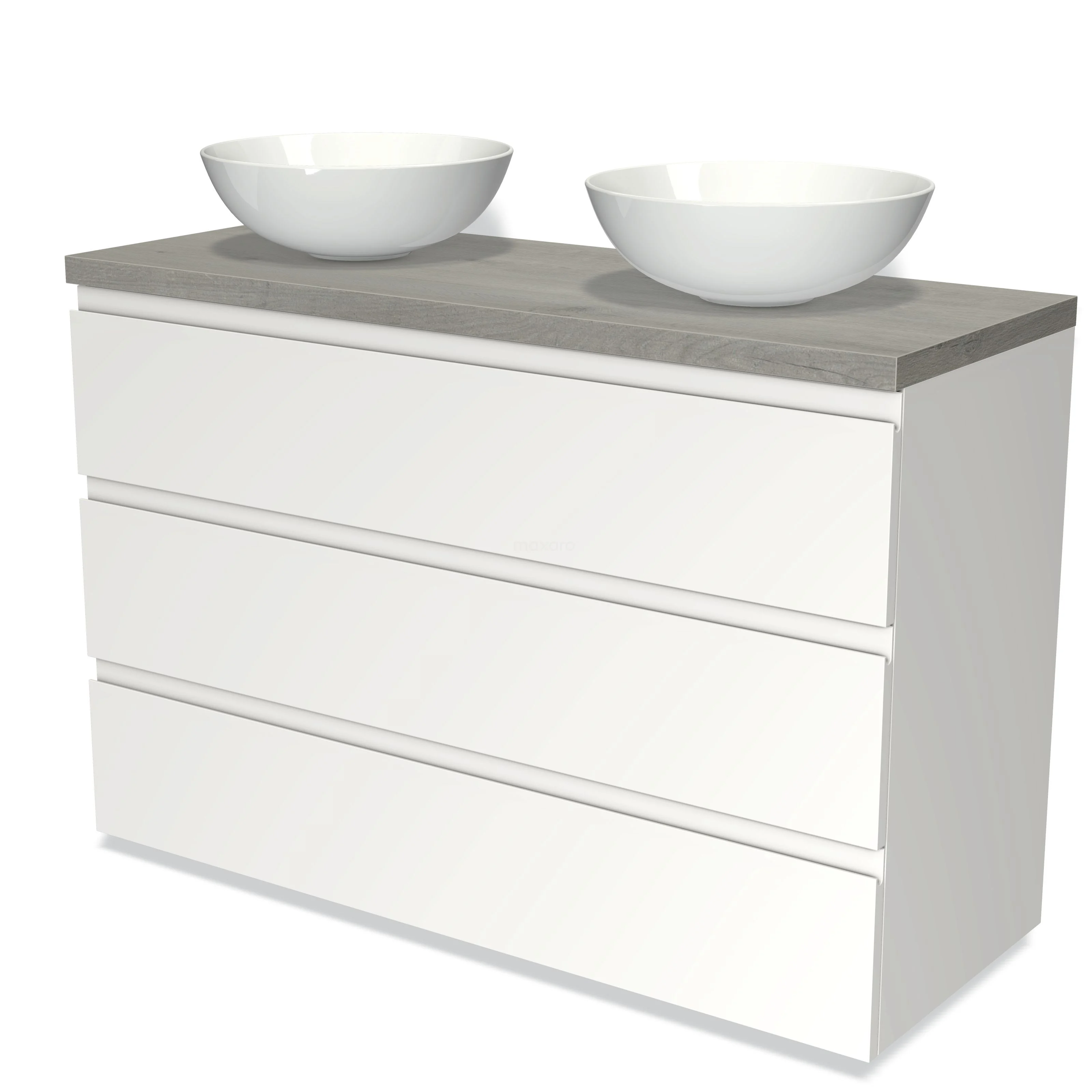 Badmöbel für Aufsatzwaschbecken 120cm Modulo Plato Matt Weiß 3 Schubladen Grifflos Graue Eiche Platte
