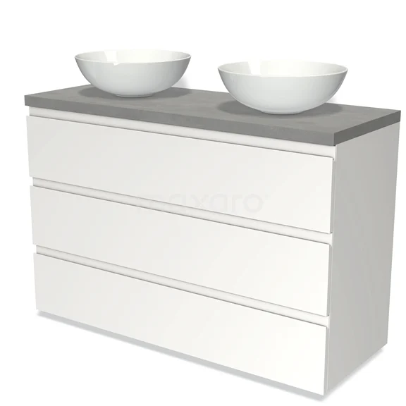 Modulo Plato Badmöbel mit Aufsatzwaschbecken | 120 cm Matt Weiß Grifflos front Hellgrauer Beton blatt 3 Schubladen
