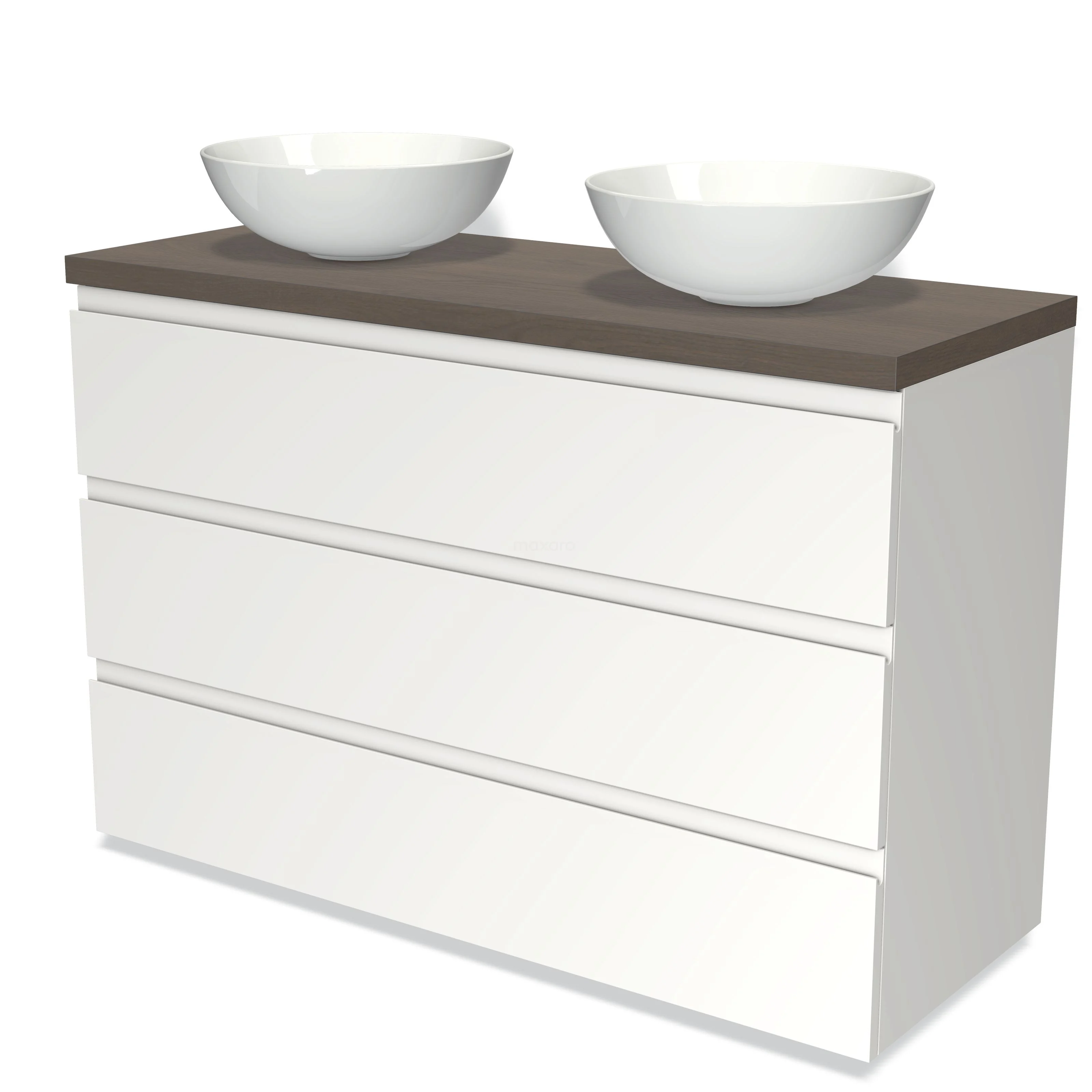 Badmöbel für Aufsatzwaschbecken 120cm Modulo Plato Matt Weiß 3 Schubladen Grifflose dunkelbraune Eiche Platte