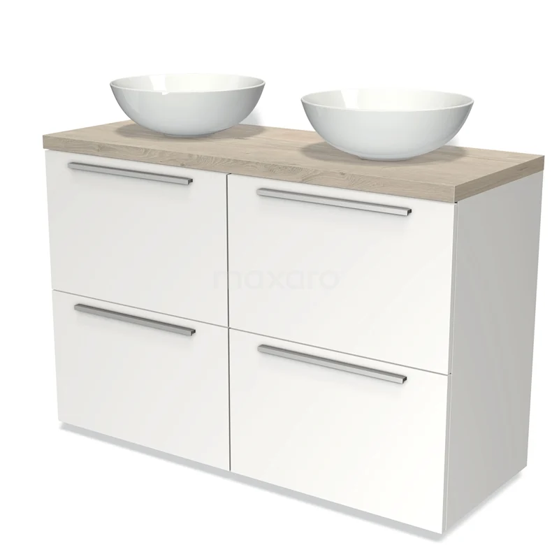 Badmöbel für Aufsatzwaschbecken 120cm Modulo Plato Matt Weiß 4 hohe Schubladen Flach hellgraue Eiche Platte