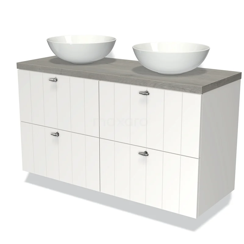 Badmöbel für Aufsatzwaschbecken 120cm Modulo Plato Matt Weiß 4 Schubladen Lamelle Graue Eiche Platte