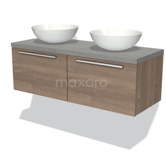 Badmöbel für Aufsatzwaschbecken 120cm Modulo Plato mittelbraune Eiche 2 Schubladen Flach hellgrauer Beton Platte