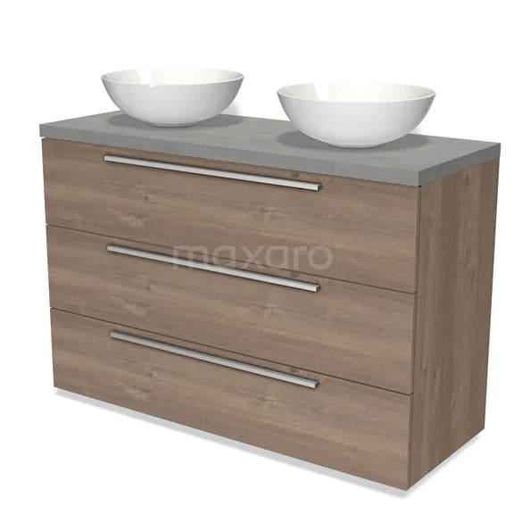 Badmöbel für Aufsatzwaschbecken 120cm Modulo Plato mittelbraune Eiche 3 Schubladen Flach hellgrauer Beton Platte