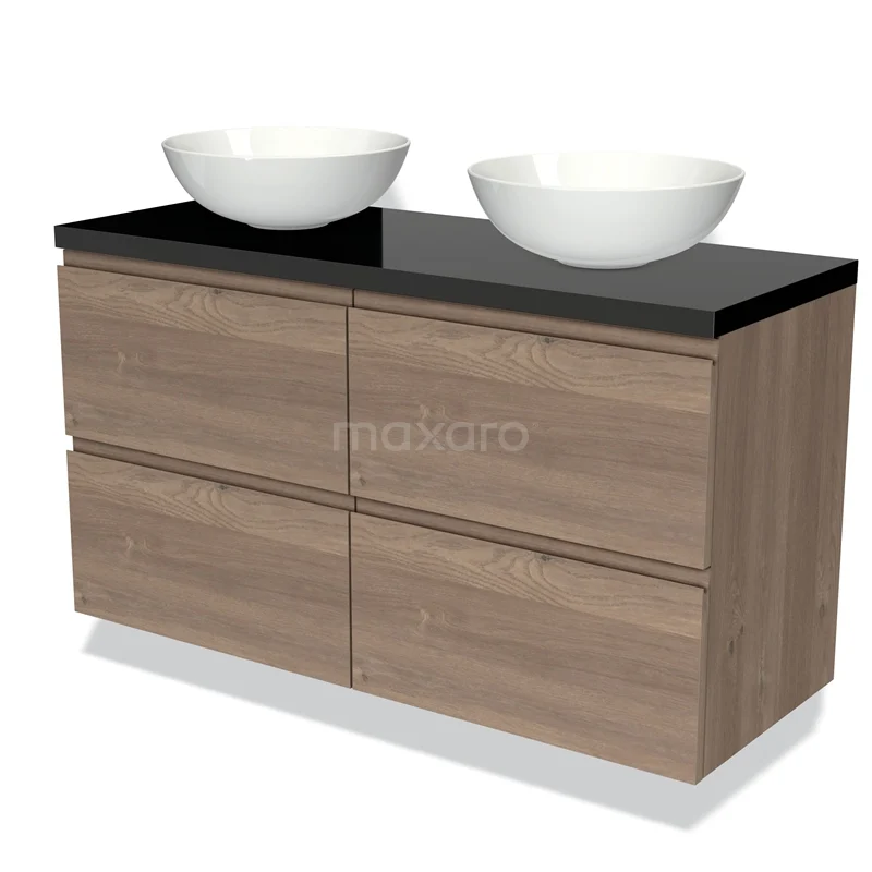 Modulo Plato Badmöbel mit Aufsatzwaschbecken | 120 cm Mittelbraune Eiche Grifflos front Hochglanz Schwarz blatt 4 Schubladen