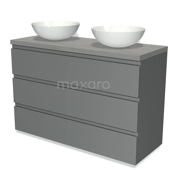 Badmöbel für Aufsatzwaschbecken 120cm Modulo Plato Mittelgrau 3 Schubladen Grifflos hellgrauer Beton Platte