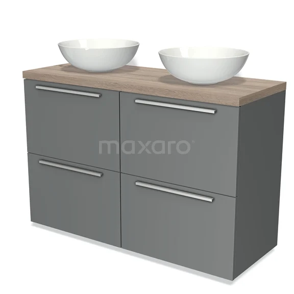 Badmöbel für Aufsatzwaschbecken 120cm Modulo Plato Mittelgrau 4 hohe Schubladen Flache Platte aus Eiche